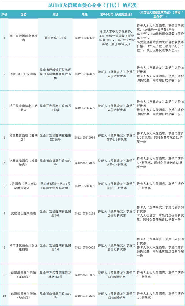 昆山市无偿献血爱心企业(门店)打折、优惠券等福利内容如下: