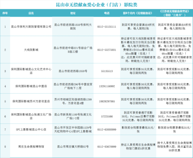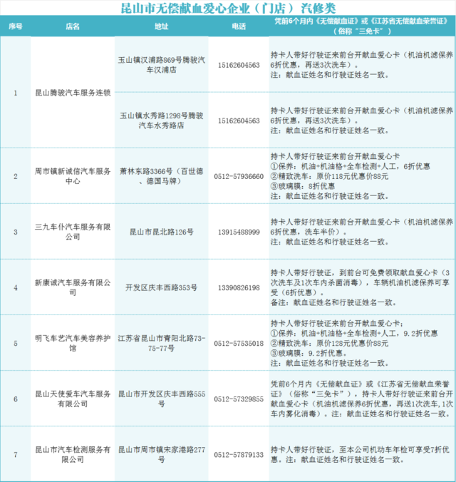 备注:昆山市无偿献血爱心企业(门店)正在不断扩充中,更多优惠福利敬请期待。