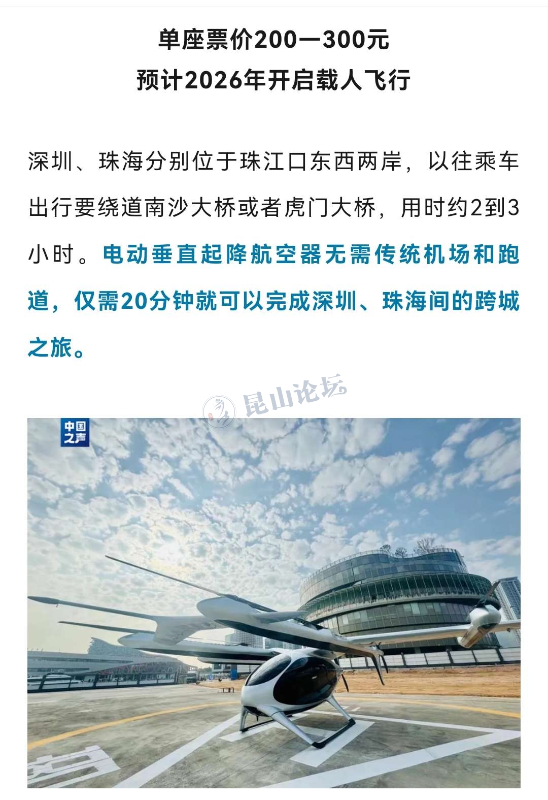 比如之前深圳到珠海的电动飞机,预计2026年开始载人飞行票价是200~300元这个价格的话就是很多人都接受得了的价格了,昆山也是有无人机公司的,今后肯定也会往这方面发展,电动飞机才是未来,这样的话价格优势就出来了,而且不用担心堵车。
