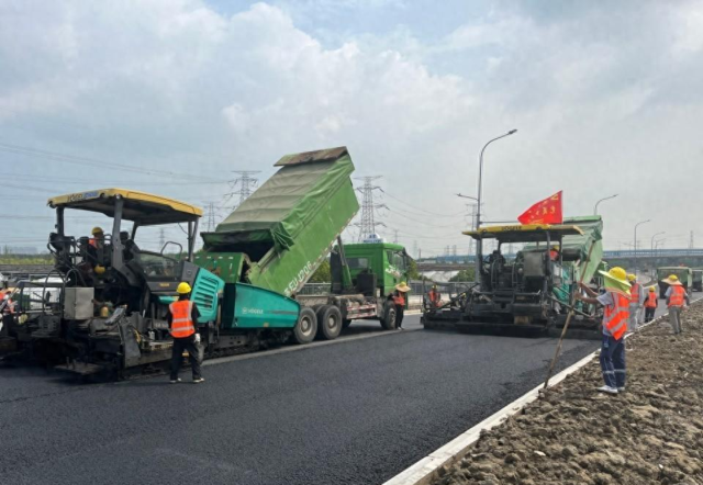 今天上午,记者在强胜路接312国道工程施工项目的工地现场,感受到了紧张忙碌又井然有序的热烈氛围,现场摊铺机、压路机、运输车往来穿梭,工人们正在进行沥青摊铺施工。