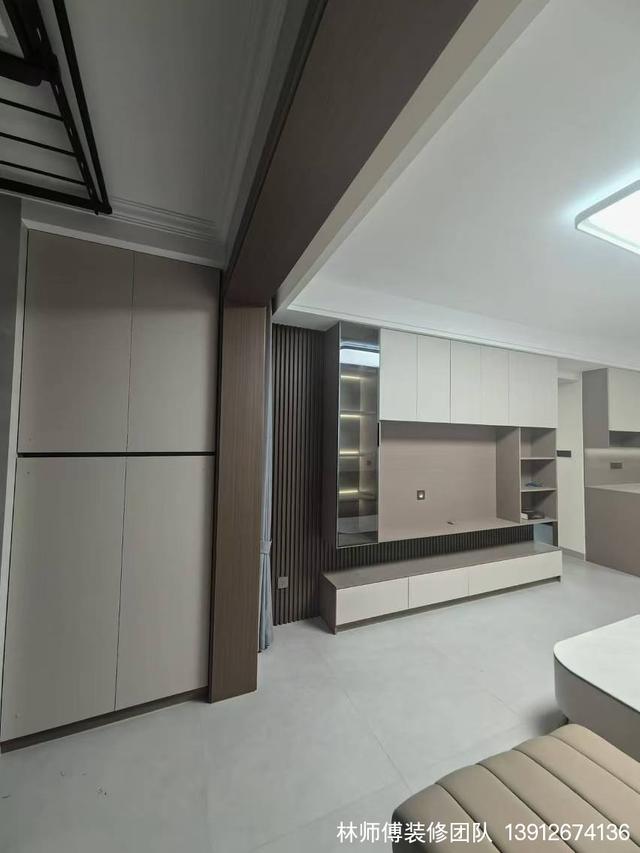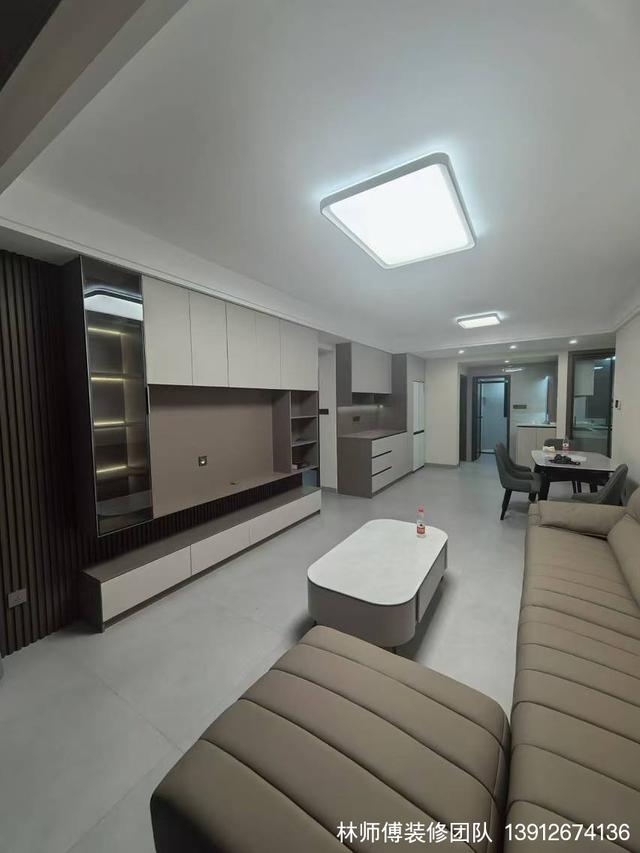 客厅也是以灰色系为基调,电视墙做了收纳背景,大大提高了家里的收纳能力,三人皮质沙发,舒适度更强。