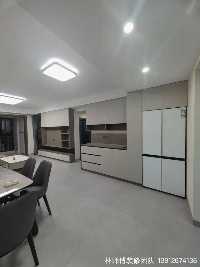 餐桌是靠墙放的,释放出更多的活动空间,餐边柜很大,冰箱内嵌其中,完整统一,美观度很高。岩板餐桌+黑色软包桌椅,打造出空间的深邃感与高级感,丰富了空间的层次。