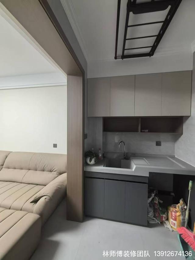 阳台的另外一半是洗晒区,水池、橱柜、洗衣机,一切都是仅仅有条。