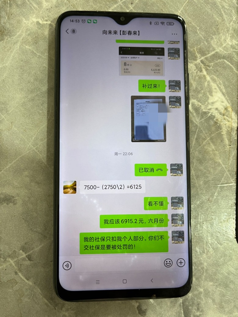 有这个就可以证明我在正常上班。这是前段时间,劳资员截图发给我的。