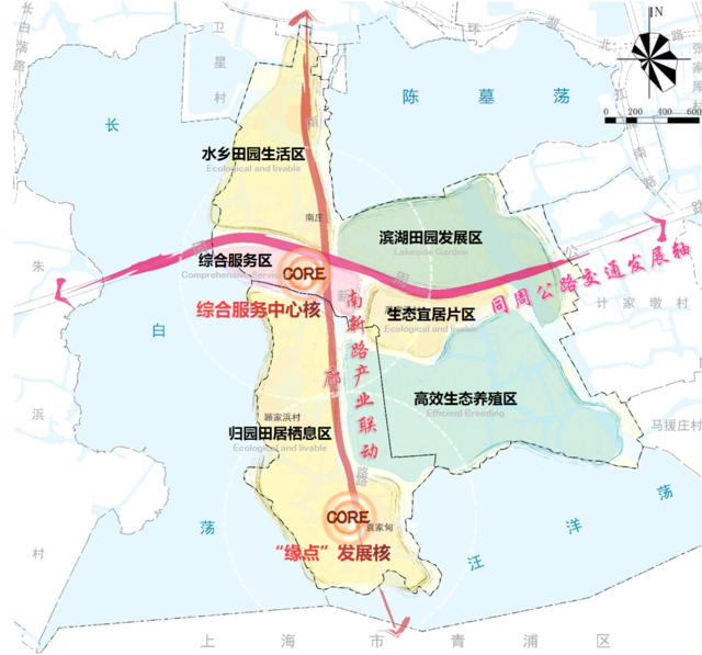 “六区”:水乡田园生活区、归园田居栖息区、生态宜居片区、综合服务片区、高效生态养殖片区和滨湖田园发展区。