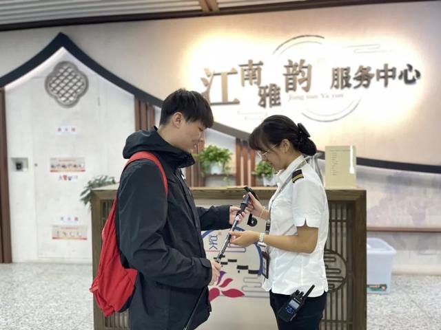 走到安检通道前,安检员们亲和礼貌的指引手势和话语“乘客您好,携带的包裹请过机安检”,引导着乘客们有序安检。苏州地铁严格落实“逢包必查、逢液必检、逢疑必问”的工作要求。