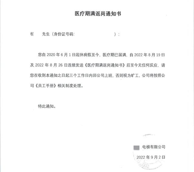 本案原告杨某医疗期超出24个月,经用人单位通知后仍以身体无法满足工作条件为由拒绝返岗。但同时,杨某自2022年5月起又在其他公司工作取得报酬,可见其并无无法克服的病症。