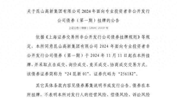 11月8日,上交所发布关于昆山高新集团有限公司2024年面向专业投资者非公开发行公司债券(第一期)挂牌的公告。