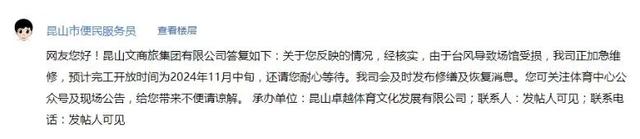 昆山文商旅集团有限公司答复如下:关于您反映的情况,经核实,由于台风导致场馆受损,我司正加急维修,预计完工开放时间为2024年11月中旬,还请您耐心等待。我司会及时发布修缮及恢复消息。承办单位:昆山卓越体育文化发展有限公司。