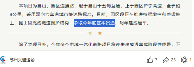 市域交通一体化娄江大道-震川西路快速化改造工程,园区段(娄江大道)、昆山段(震川西路)同步实施,建成后快速路主线双向六车道,地面辅路园区段双向四车道、昆山段双向两车道,并与现状G312形成互通。该工程西起园区沪宁高速跨线桥东,东至昆山古城路,全长约7.2km。