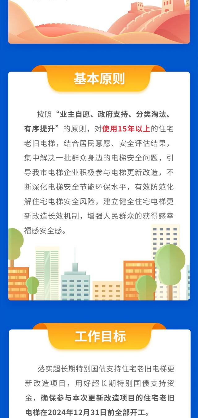 ● 重点支持更新投入使用15年以上(2009年1月1日前办理使用登记)、运行故障率高、安全隐患突出、群众意愿强烈的住宅老旧电梯;