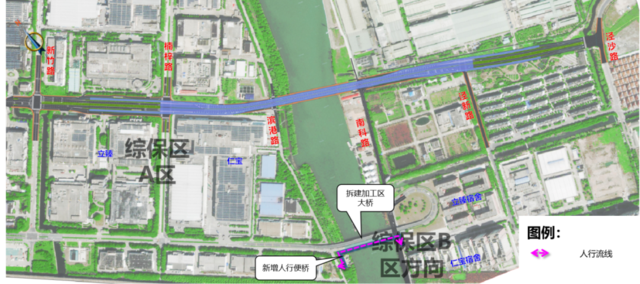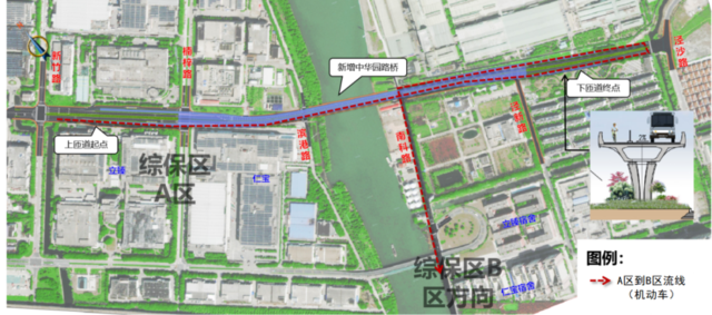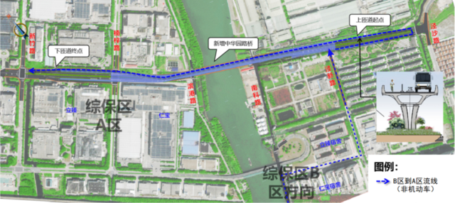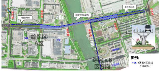 新竹路东侧上匝道—中华园路高架桥—泾新路东侧下匝道—中华园路地面辅路—南科路—综保区B区