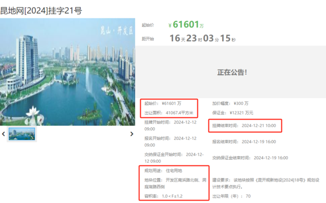 关注,昆山市国有建设用地使用权网上交易系统新挂出一宗住宅地块——昆地网[2024]挂字21号,地块位于开发区南浜路北侧、洞庭湖路西侧,2024年12月21日上午10点正式开拍,起拍楼面价12500元/㎡。