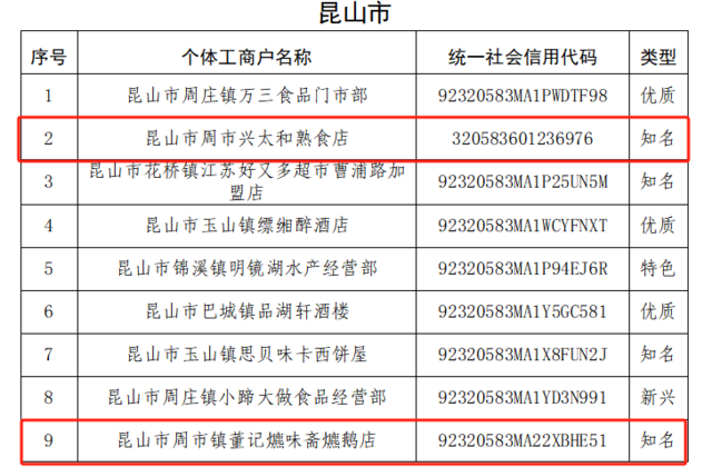 近日,2024年下半年苏州市“名特优新”个体工商户拟认定名单公布,昆山市周市兴太和熟食店、昆山市周市镇董记爊味斋爊鹅店成功入选!