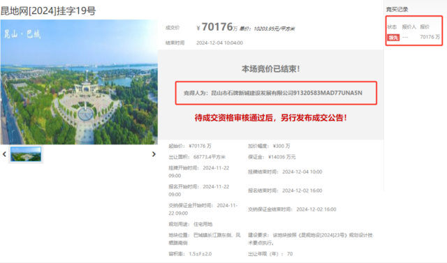 本案为住宅用地,出让面积68773.4㎡,昆山市石牌新城建设发展有限公司(昆山市国资办)底价竞得,成交总价70176万元,成交楼面价5102元/㎡,本场土拍无溢价。
