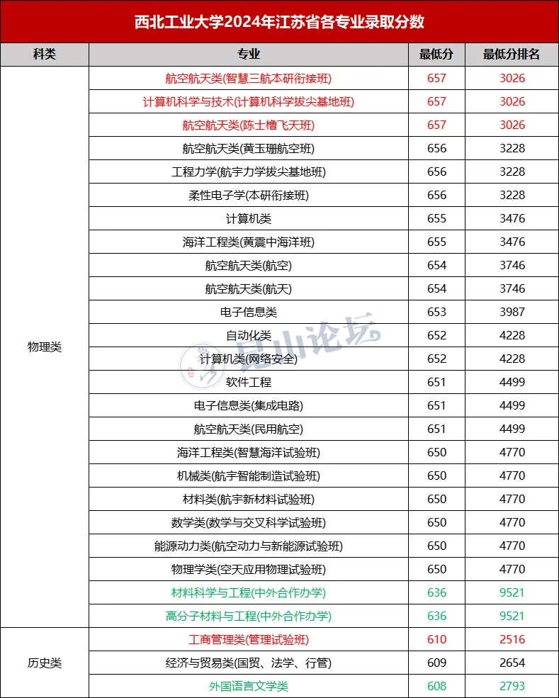西北工业大学2024年物理类招生在江苏省录取分数线最高的专业是航空航天类(智慧三航本研衔接班)、计算机科学与技术(计算机科学拔尖基地班)、航空航天类(陈士橹飞天班)专业,最低录取分657分,省排最低位次3026位;录取分数线最低的专业是材料科学与工程(中外合作办学)、高分子材料与工程(中外合作办学)专业,最低录取分636分,省排最低位次9521位。