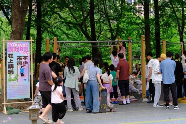▲市民在公园“健身广场”参加“杠上嗨玩、币不可少”游戏