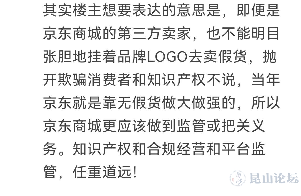 楼主前天一个帖子《触目惊心,京东商城假货满天飞》,有3万多人阅读,接近200楼评论,很多人告诉我去京东买东西,选择京东自营认为我不懂如何在平台购物,更有网友说我少见多怪,我也活了几十年,怎么可能不知道上京东商城首选京东自营,我不是让你教我如何上网购物,我发贴,是为了泛起更多人对知识产权行为侵权的麻木不仁,需要更多人发声,更多人站出来,更多人对侵权行为说不,国家才会重视起来,不仅是京东,是各大平台都有审核,监管义务,都有对侵权行为说不的义务和责任!