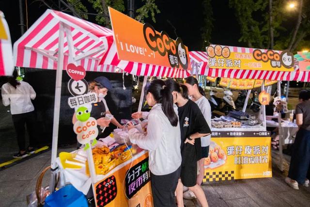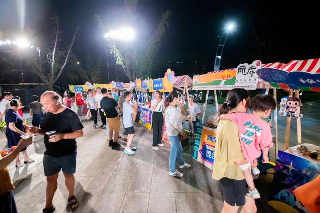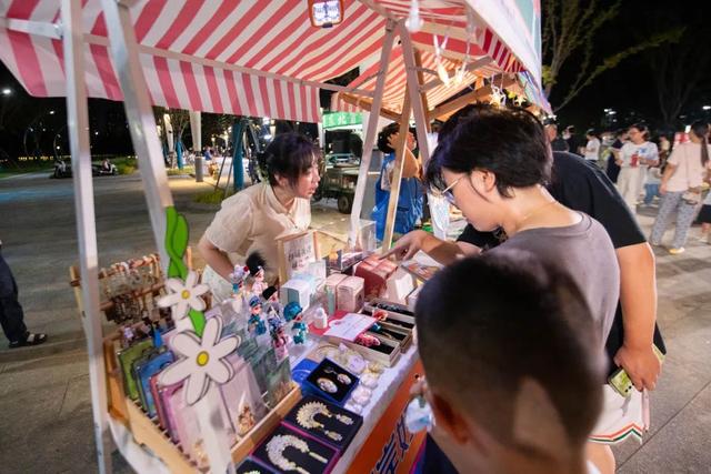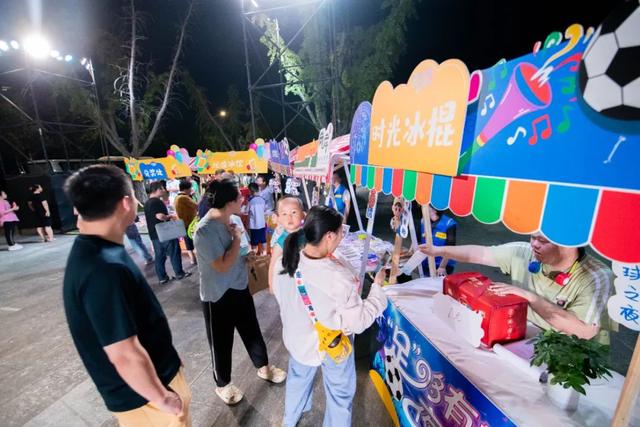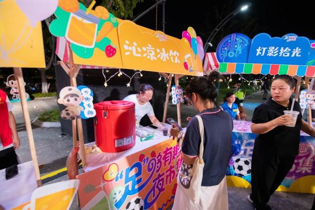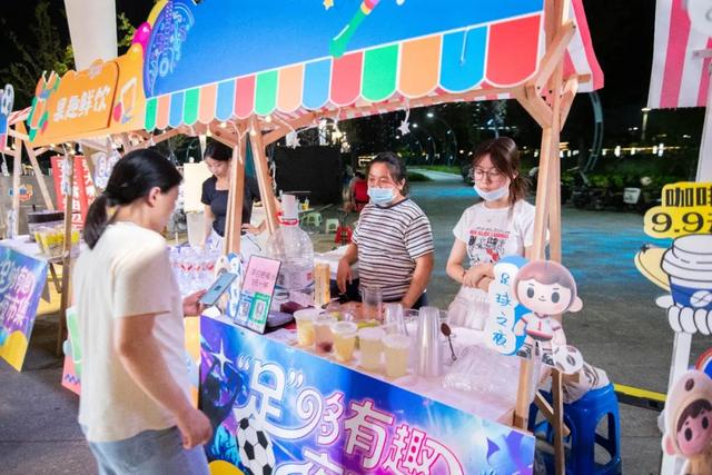 歌声缭绕中,夜市的烟火气也随之升腾。还未到七点,足球赛尚未开始,“足”够有趣夜市集已是人头攒动。十六个摊位沿广场依次排开,统一集团、两岸好物馆等带来各式惊喜:别出心裁的足球主题文创、精致温馨的手作小物、香气四溢的水果点心和现调饮品……市民们穿梭其间,或挑选心仪物品,或品尝美味小吃,好不热闹。