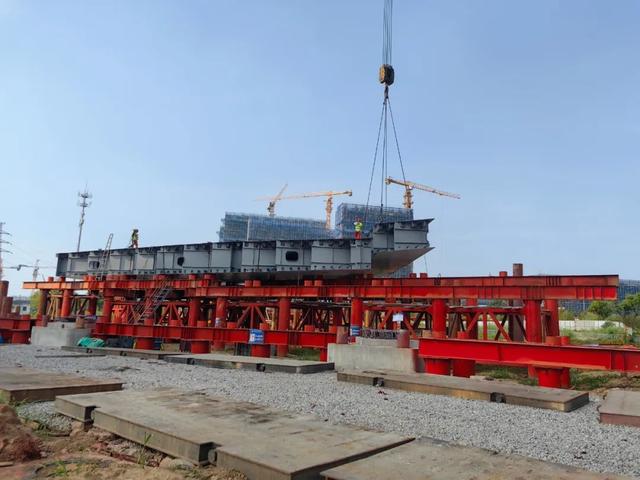 作为整个工程的关键控制性节点——张家港大桥,全长285米,主桥采用跨径组合为59+86+64米的三跨变截面连续钢箱梁。在施工现场,大型吊机高高耸立,工人们各司其职,在指挥人员的精准指挥下,将一块块巨大的钢结构件缓缓吊起,精准地安装到位。整个过程紧张有序,展现出了施工团队高超的技术水平和严谨的工作态度。