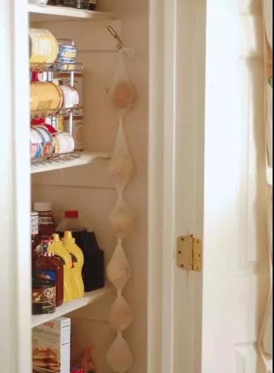 ▎防止食物发芽 ▎洋葱、土豆等根茎类蔬菜不通风保存的话,很容易发芽变质。将它们分别装在丝袜里,每装一个洋葱,打一次结,挂在通风干燥的地方,能延长保质期。