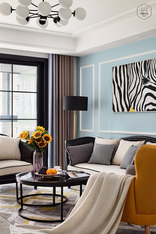 在卧室的设计上,设计师大胆的选用了深蓝色的背景墙搭配金色的吊灯,再者以米黄色带入柔和温润的基调,并通过精致的灯具以及充满艺术感的背景墙面,增添室内的格调,在此基础**屋主的想法以更为现代的家具形式融于室内,将理念与设计相结合。