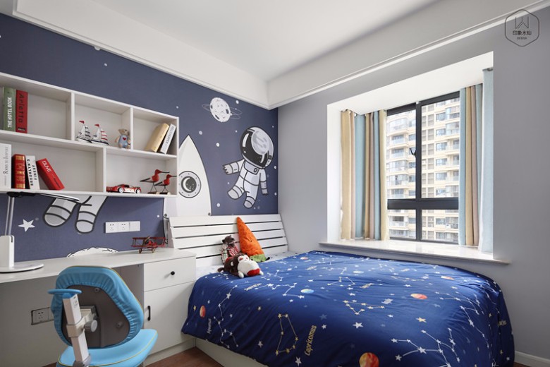儿童房,以蓝色为主色调,在炎热的夏日,带来凉爽的感觉。在空间中运用此色,可以调和空间质感,释放空间魅力。蓝色的活力如孩子一般,彩色的窗帘,卡通元素的融入,孩子的世界俏皮又可爱。