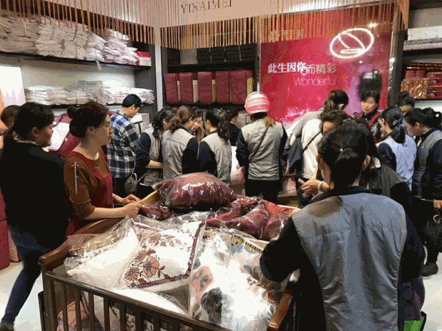 展厅超大,一排排各式各样的床上用品让人爱不释手,就像置身于一个精致床品的艺术博物馆,给人一种非常舒心的感觉。