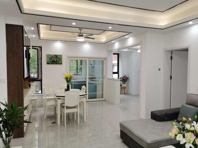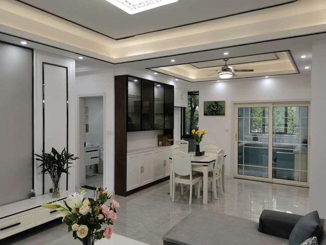 餐厅与客厅是一个整体,包容性很强,颜色上都采用白色为主,黑色包边点缀,整体感很强。餐桌墙边也做了一套柜子用来收纳,餐厅灯买的是风扇灯,夏天吃饭很实用哦~餐桌上的鲜花,给生活带来了满满的仪式感!