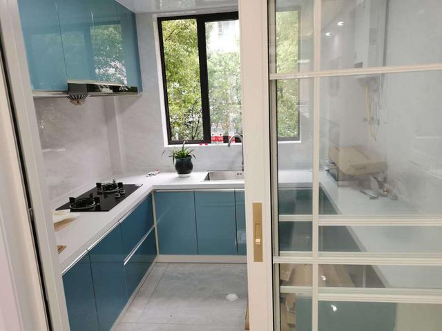 U型厨房,操作起来非常方便,厨房移门用的是白色玻璃移门,透光性好,这样整个厨房的采光就变得非常通透,连带餐厅的光线也变好了!