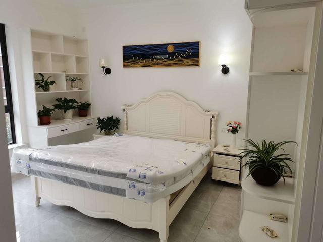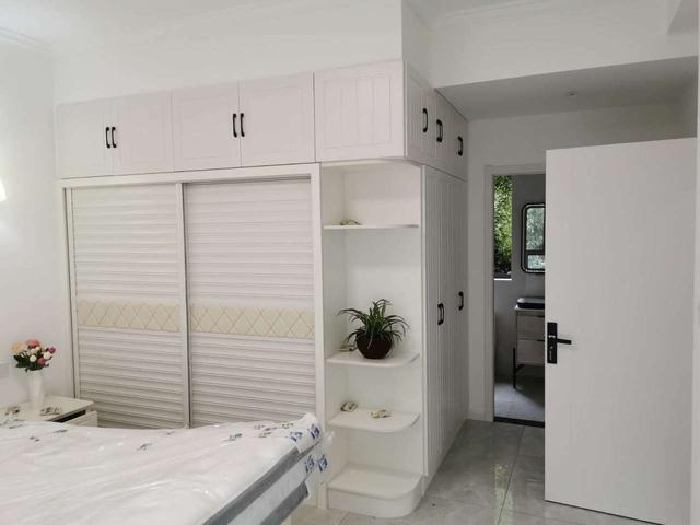 主卧从进门到室内都做了衣柜,不怕衣服不够放啦!转角做了开放空间用来储物。床的另一边做了梳妆台,上面也做了开放式格子,不管是放饰品还是书籍都非常方便。