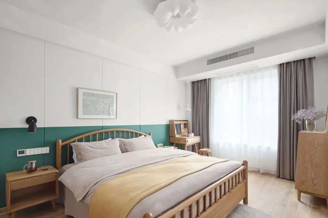 横向拼色一般可以分为二分法和三分法两种,二等分法是横向拼接中最简单的一种拼色方式,只需一款有色墙漆+白墙即可完成。将墙面等分上色,也很符合现下复古风,两种颜色搭配既不单调,又不花哨,为整个空间构建出一种鲜明的对称美。