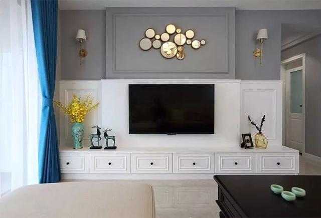 电视背景墙做的设计就会比较多一些,底部的电视柜和卡座相互呼应,电视区域刷成白色,两侧做对称的设计。电视上方刷成灰色,还做了创意的镜子造型。