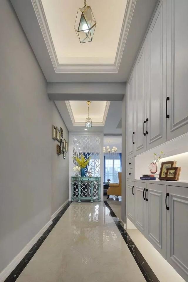 入户的玄关是一个长走廊的户型,设计师在玄关和客厅之间还加了端景台和隔断的设计。玄关走廊的侧方做嵌入式的鞋柜,留空处加上藏光更加实用。