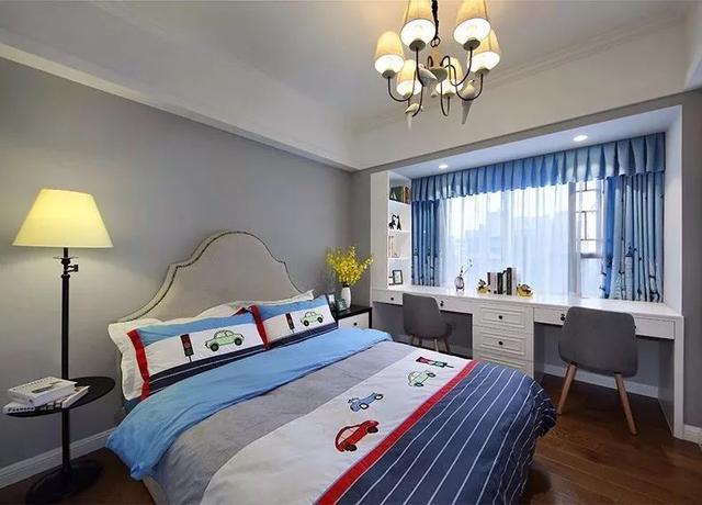 儿童房的设计就会更为简约一些,灰色调的背景搭配卡座的床品,在靠窗的位置做个双人位的书桌,方便孩子读书学xi的时候,父母也能陪伴。