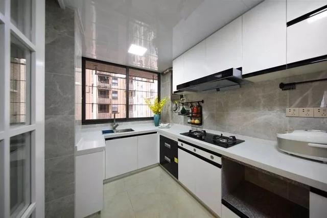 厨房内部的配色以白色和浅灰色为主,L型的橱柜搭配一个窄边柜,在墙面也做了实用的挂杆设计,整个厨房看起来非常的整洁。
