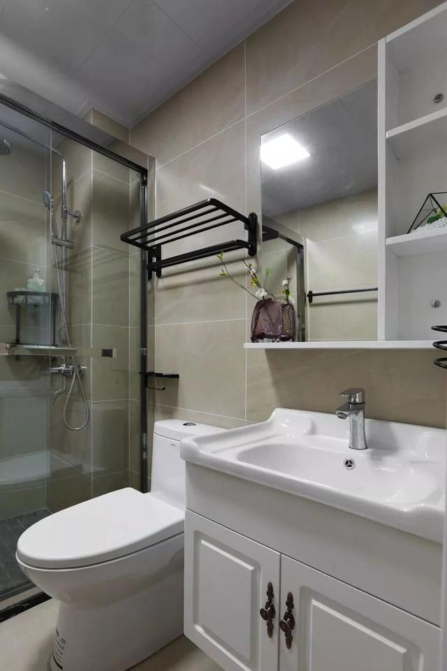 卫生间的设计也比较简洁一些,白色的卫具搭配米色的墙地砖,在墙面做了丰富的收纳设计,方便摆放洗漱用品、化妆品等等