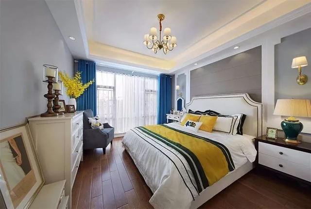 主卧室的床头背景墙分成了三个不同的边框,中间灰色+两侧蓝色,搭配两色的床单与细节软饰,用蓝色的窗帘营造出静谧的空间,置身其中感觉安静而又暖心舒适。