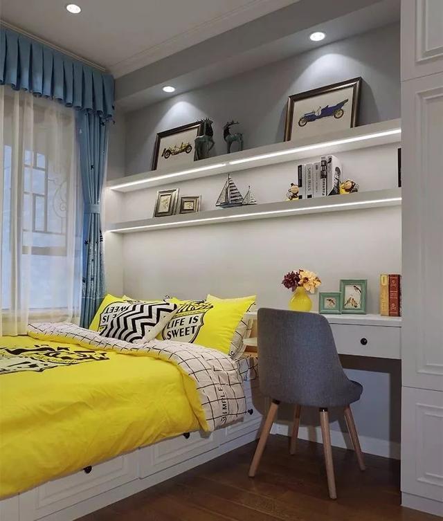 书房的设计以实用为主,做了一个榻榻米床来搭配书桌,床头背景墙上还有着隔板和灯光的结合设计,不管是装饰还是收纳都挺实用的。