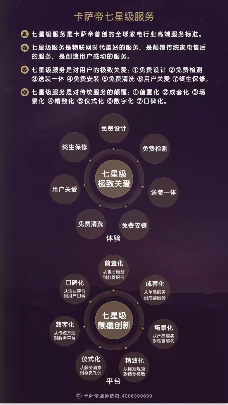 卡萨帝:国际高端家电品牌卡萨帝在全球市场的品牌为Casarte,源于意大利语,“La casa”是“家”,“arte”是“艺术”,Casarte将两者合二为一,寓意“家的艺术”。卡萨帝,国际高端家电品牌。她为爱而生,是家的艺术卡萨帝品牌创立以来,不忘初心,像做艺术品一样做家电。她用超前战略眼光,洞察消费升级,保持技术引领,始终追求科技、精致、艺术,如今已成长为实至名归的国际高端家电品牌。2020年 卡萨帝从成套到智慧成套再到智慧场景,开始了新的颠覆。饮食场景 护衣场景 住居场景 娱乐场景全面开花不再是简单的单品功能服务,而是提供主动服务,为高端用户带来衣食住娱 场景的全新生活方式2021年 卡萨帝上榜世界品牌实验室榜单,品牌价值505.81亿元,成为榜首中首个高端家电品牌这是卡萨帝探索物联网生态的硕果,更是奔赴下一程的起点门店地址:1.翠薇东路红星美凯龙星艺佳商场2F西厅卡萨帝旗舰店 2.前进西路红星美凯龙至尊Mall -1F卡萨帝旗舰店联系电话:18963675369