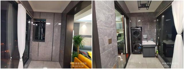 阳台沿用了客厅的风格,不管是砖的颜色还是橱柜的设计,都和客餐厅是统一的,整体性非常强。一边是生活阳台,一边是功能阳台。
