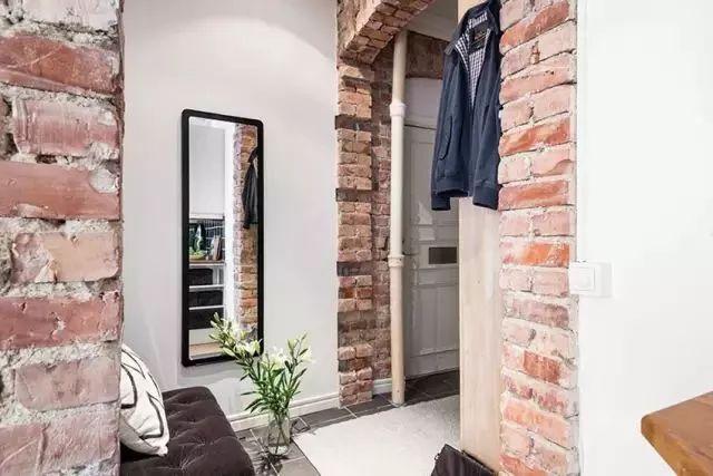 下图案例是一个超小户型,实用面积不超过30平米。但屋主设置了一个非常有格调的玄关,用红砖砌了墙面,非常有个性。还设置了坐椅和穿衣镜,方便出门时整理仪态。