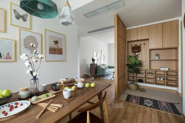 玄关虽然在家居中面积不大,却是进出的必经之路,同时也是展示家居风格的点睛之处。比起进门后鞋子踢得满地都是,不如在玄关设置鞋柜,这类设计低调实用。也可以挂几幅有意寓的挂画,给初次到来的朋友一些小小的惊喜。