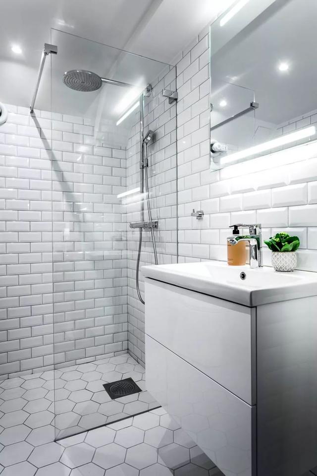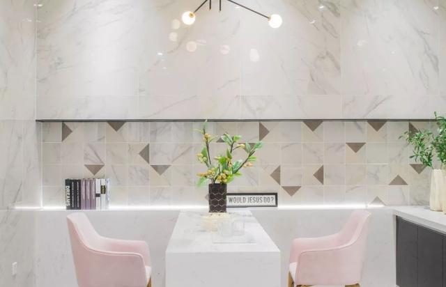 下图案例墙面主色调是雪花雕像白,辅助以小花砖增色,相比于整片大面积使用一种瓷砖铺贴的方法,这样搭配让空间更加生动。