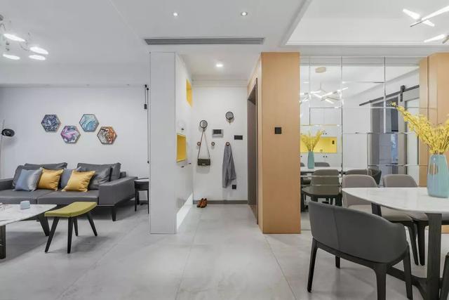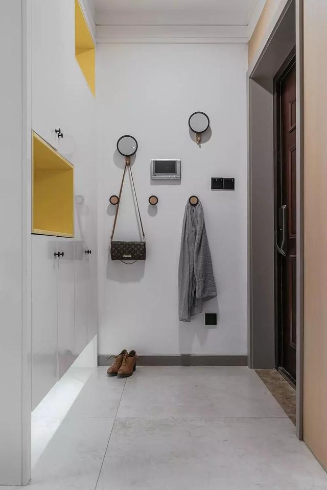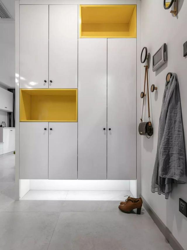 推门而入,纯净的白色和温暖明亮的黄色的玄关鞋柜不但增加收纳空间,还格外地显得温馨。