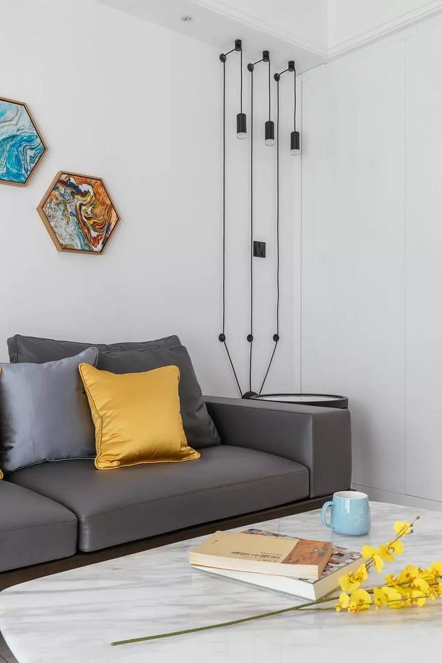 沙发作为客厅的必备之物,我们选用灰色皮质沙发,因为家中的整体色调偏淡雅,需要一些深色调体现空间的厚重感。