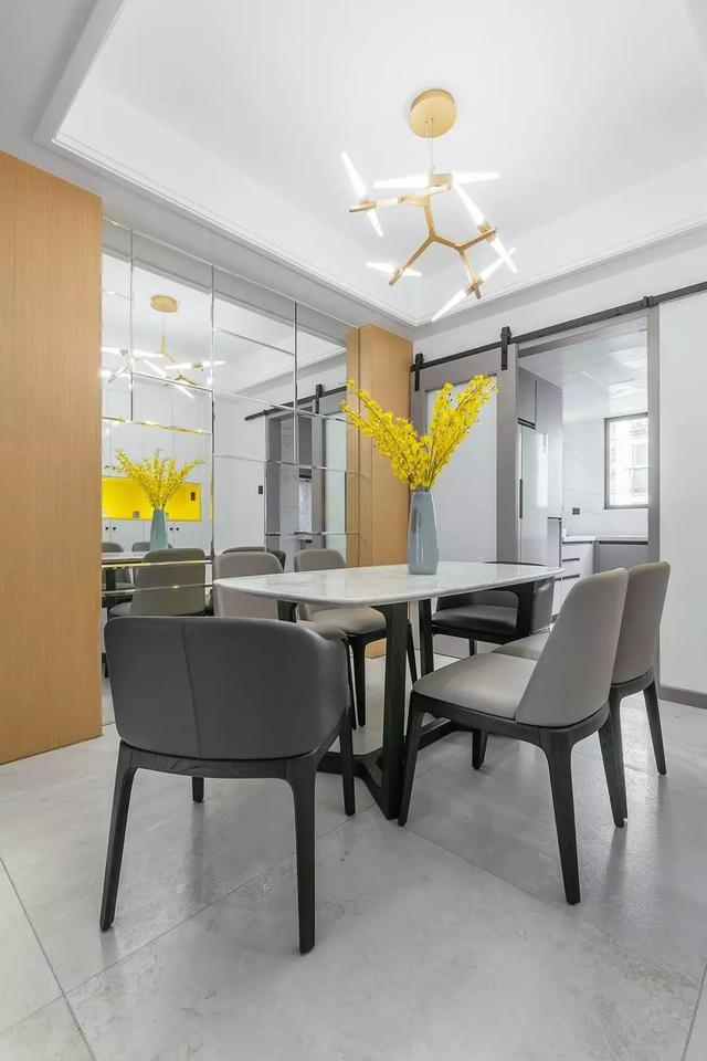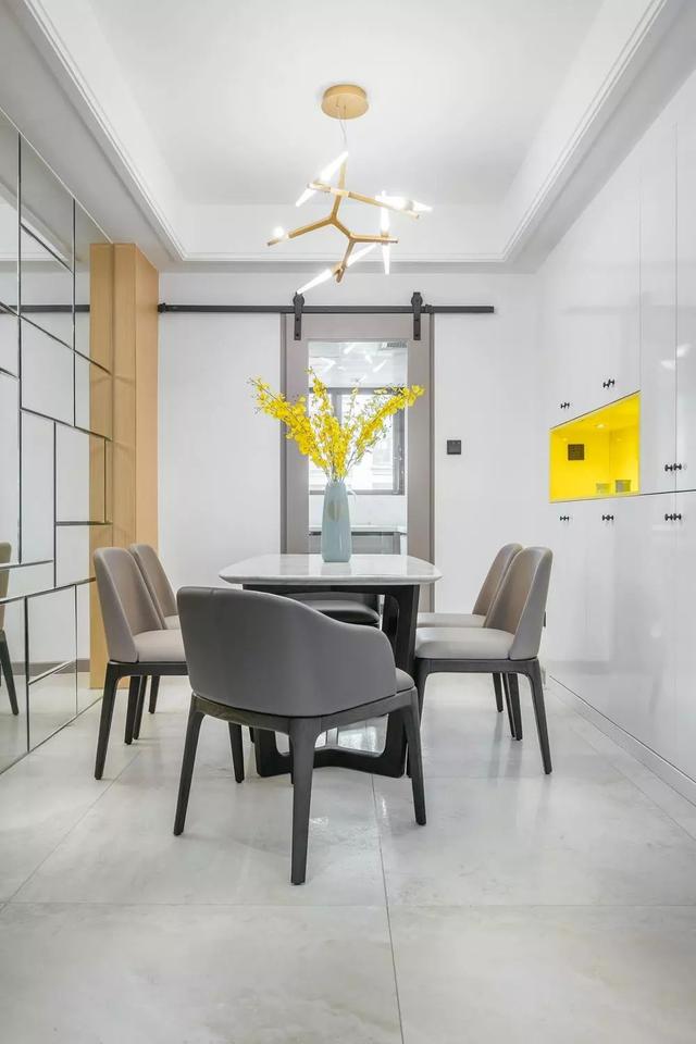 用清冷的银镜来放大空间视觉和提升光感。延续客厅的纯白和明黄构筑出温馨质朴的空间氛围。