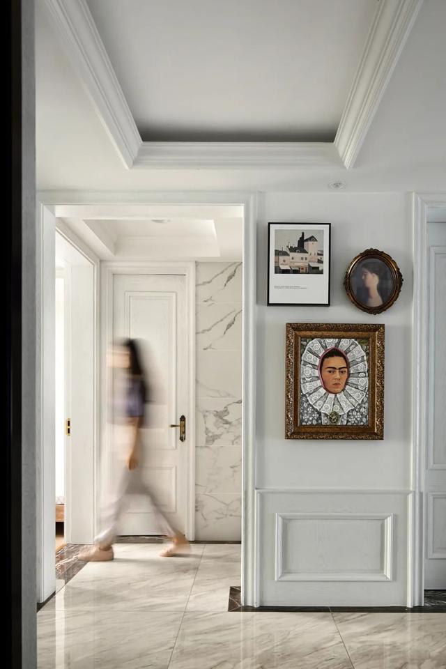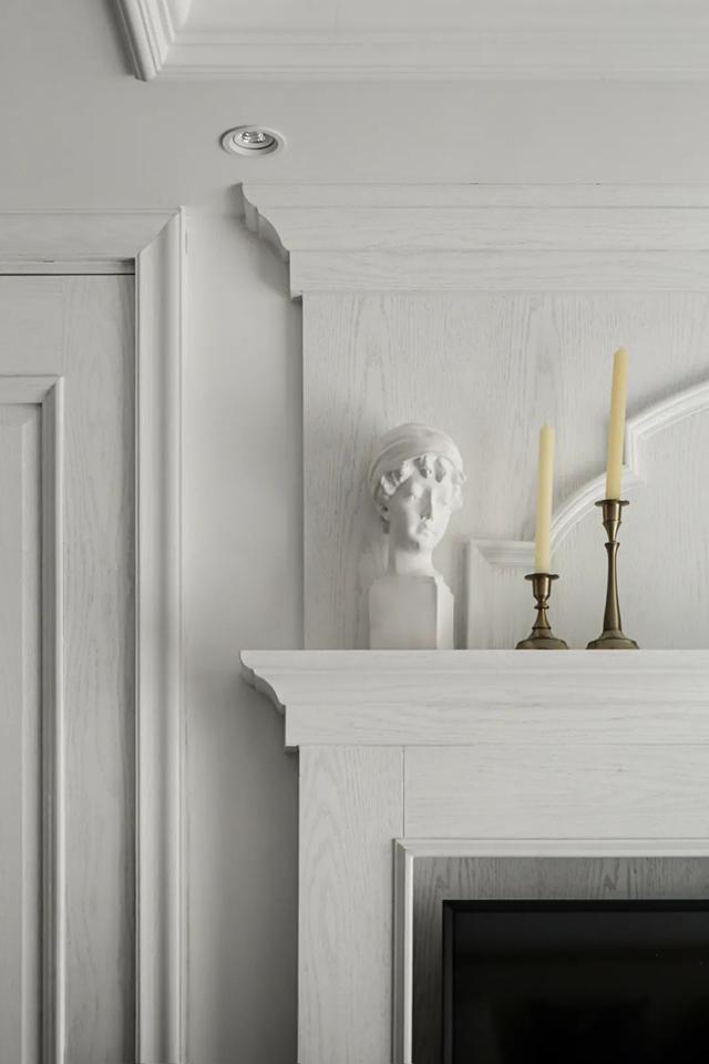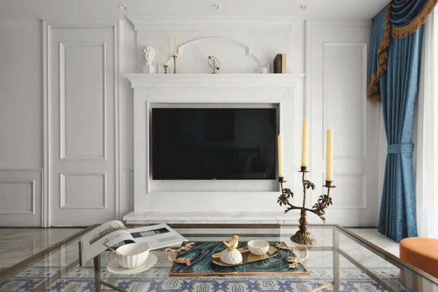 主卧门是个隐形门,这样可以让空间看起来更加的统一,电视背景墙没有复杂的设计,主要凸出线条感,还原古典的法式之美。