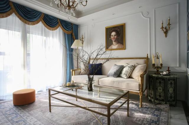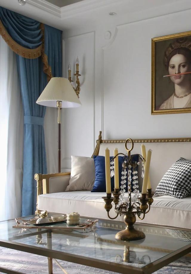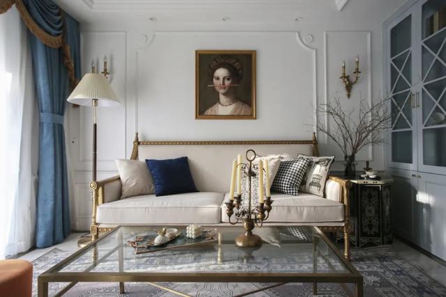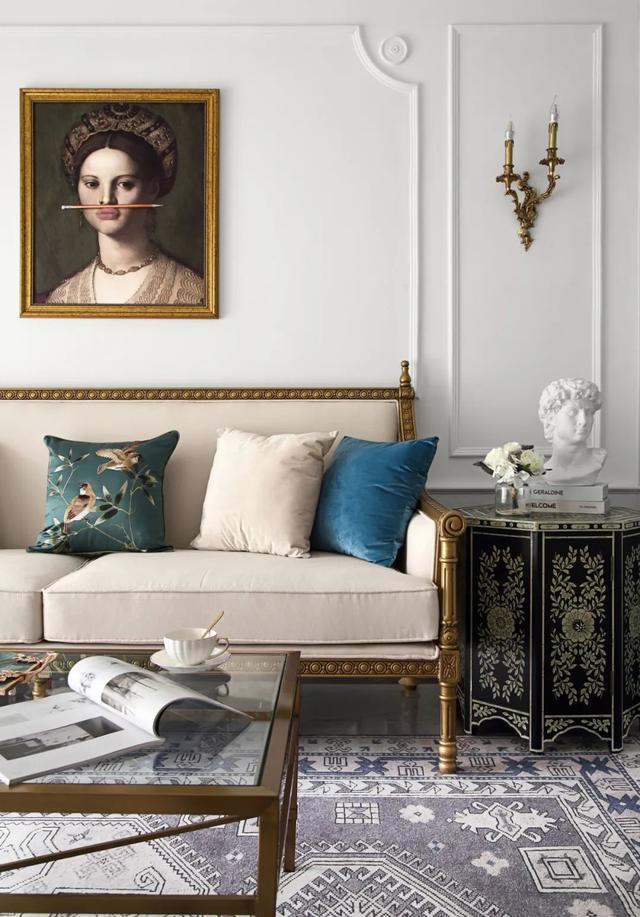 米白色跟金色的搭配真是一绝,复古又温柔,不服都不行,蓝色丝绒材质的靠枕打破“平庸"加上壁灯跟挂画的点缀艺术值拉满!