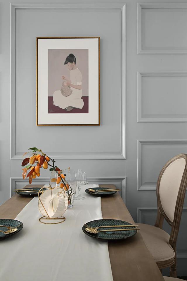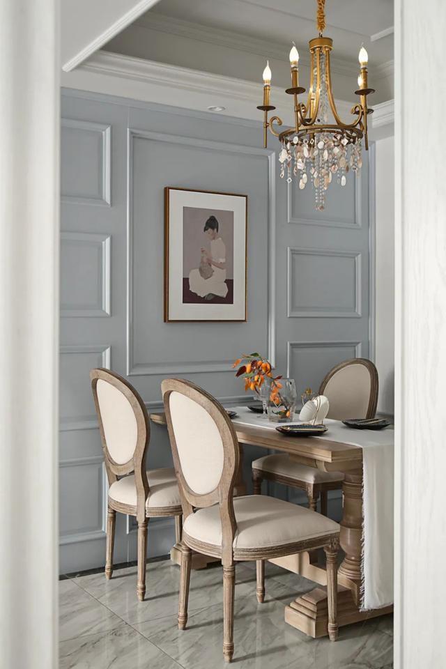 餐厅用了整面的护墙板,刷成了屋主最爱的灰蓝色。